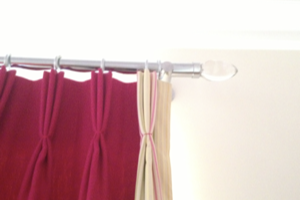 pink linen, triple pinch pleat curtains with striped contrast border on the leading edges