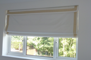 Sitting room roman blind set out of the recess in bold casamance fabric